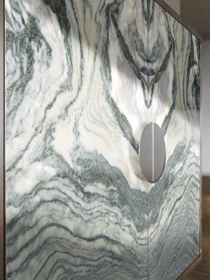 Nový AlterEgo zaujme na první pohled kombinací ručně orbitálně broušené nerezové oceli a dveří z mramoru Cipollino. Právě tento kámen s výraznou kresbou a plastickým žilkováním dodává jinak technicistnímu kusu nábytku emotivní a dekorativní rozměr. Každý kus je originál – struktura kamene vytváří jemný trojrozměrný efekt, který reaguje na světlo i okolní prostor.