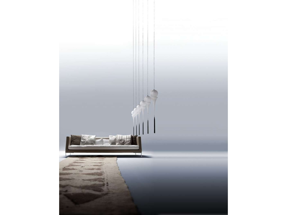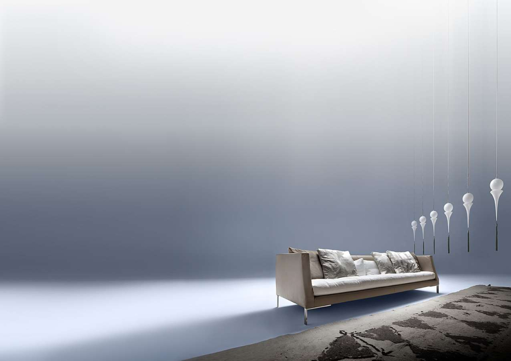 Moderní luxusní sedačka Altoborgo se vyznačuje vysokými opěrkami, které jsou ve stejné výšce jako zádová část a velmi tenkou základnou.