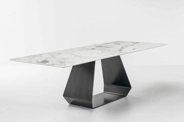 Základna, označená konturami připomínajícími tvar diamantu, je vyrobena z vícebarevného lakovaného kovu nebo s leštěným povrchem; deska je k dispozici v různých variantách keramiky, skla nebo dřeva. Bohatost materiálu ukazuje hru rovnováhy a dělá z Amond mnohostěnný stůl, který lze snadno integrovat do klasického i moderního prostředí.