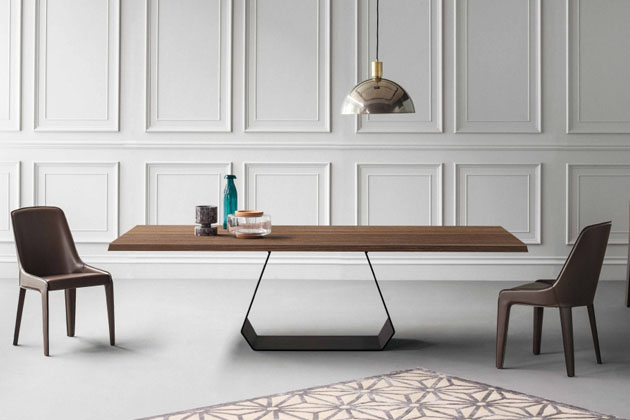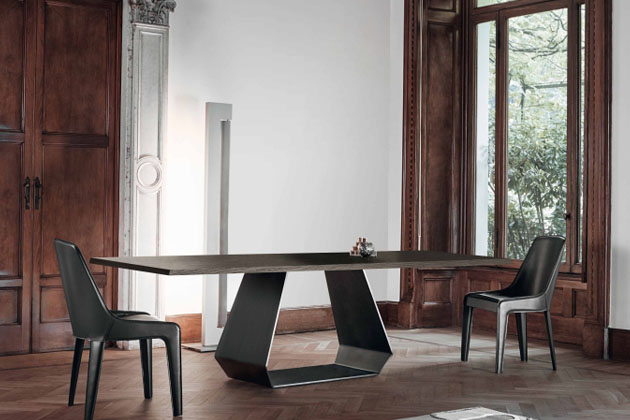 Stůl Amond si díky kontrastu mezi deskou a základnou zachovává skvělý pocit rovnováhy a téměř vytváří iluzi zavěšené desky.