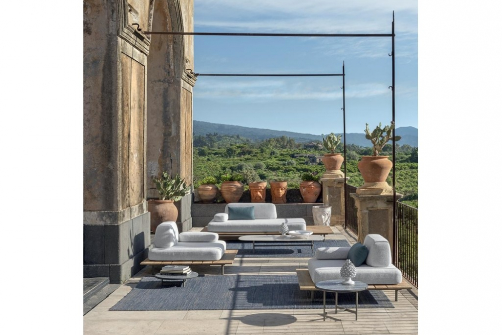 Calipso je nabízeno ve třech různých modulech, z nichž každý se skládá ze základny vyrobené z přírodních teakových lamel v různých velikostech. Hliníkový rám je obzvláště diskrétní, takže sedadla vypadají jako „plovoucí“. Měkké matrace jsou k dispozici ve třech velikostech a spočívají na základně, která je větší než samotné matrace, aby byla umožněna maximální volnost při umístění každého prvku, podle potřeby.