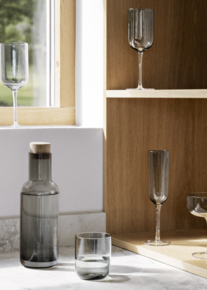 Sklenice Flow (blomus), design Theresa Rand, kouřové sklo, cena dvou kusů 764 Kč, karafa 1,1 l, cena 1 019 Kč