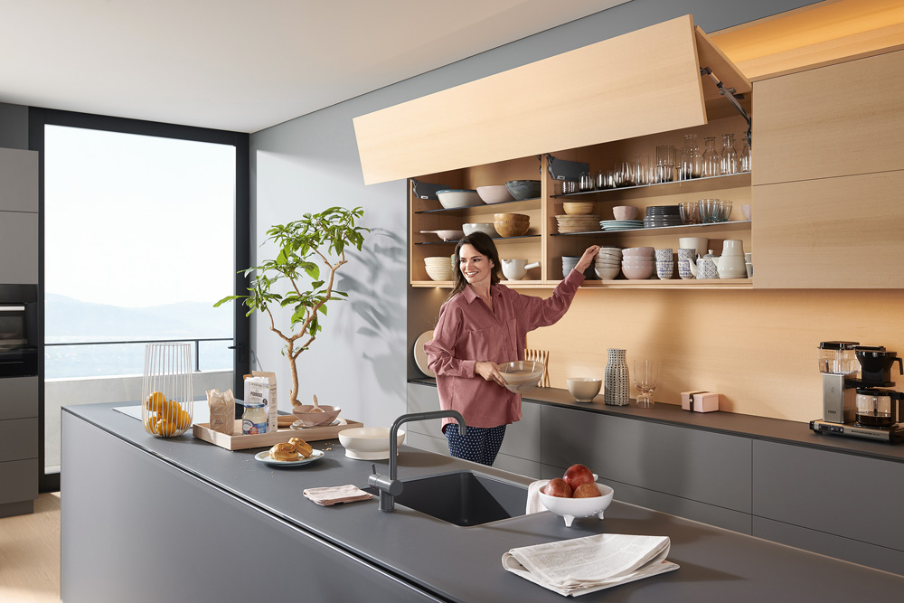 Aventos díky kombinaci snadného otvírání a integrovaného Blumotion přináší zcela nový emocionální zážitek při otvírání a zavírání. S technologiemi pohybu Servo-Drive nebo Tip-On se dají lehce obsluhovat i bezúchytkové výklopy.