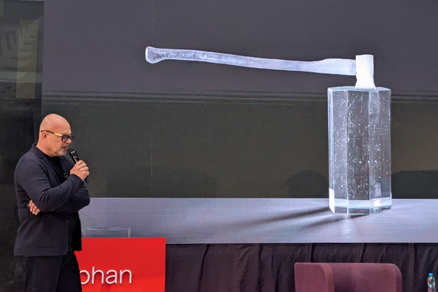 Výraznou část prezentace věnoval duchovnímu přesahu své tvorby. Sklenění apoštolové – každý podobný Kristu, a přece padlý – jsou jedním z nejsilnějších symbolických děl. Vznikli z jednoho kusu skla, bez spoje, beze švu. Plesl hovořil o tom, že krása nestačí – objekt musí mít duši. A právě ta v jeho tvorbě rezonuje – například i v růži nebo špalku se zaseknutou sekerou, která je pro Ronyho Plesla osobní. Je to vzpomínka na dědečka, který ho jako malého učil sekat dříví. Každý den, protože topil dřevem a uhlím, vytáhl sekeru ze špalku a začal štípat. A malý Rony mu u toho stál po boku a pomáhal. Ten rytmus, ten zvuk, ta chvíle… to všechno je v tomhle kuse.