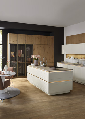 Foto: Nolte KüchenKuchyňská linka složená z programu Frame Lack v dekoru Magnolia a dýhovaného programu Tavola v provedení Dub pinot.