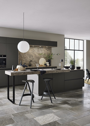Kuchyňská linka v dekoru Velluto s úpravou proti otiskům prstů, doplněná obkladem a pracovní deskou s laminátovým povrchem v dekoru Mramor Imperiale.