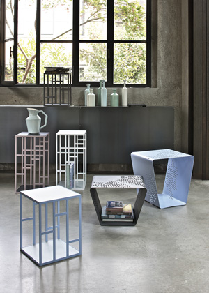 Neklid zachvátil i drobné stolky. Okatě vtipkují zdánlivou vratkostí na křivých či mnoha tenkých nohách i divokými tvary v odlišných výškách. Hravost čiší ze všech materiálů i barev, kterými oplývají.