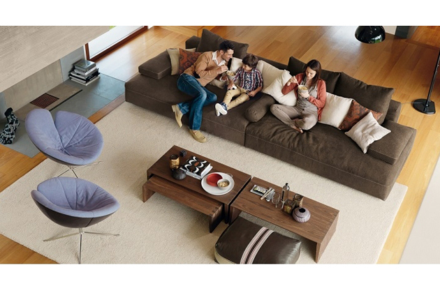 Modulární pohovka pro celou rodinu i časté návštěvy. Sestává z různých dílů a všechny mají velkorysé rozměry a pohodlné peřím plněné polštáře.