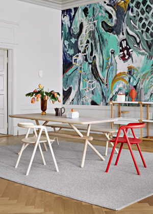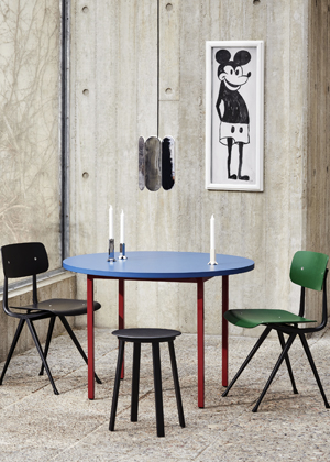 Two-Colour (HAY), design Maarten van Severen, jídelní stůl s podnoží z práškované oceli a s deskou z odolného MDF materiálu Valchromat, cena od 30 123 Kč (průměr 105 cm) → www.stockist.cz