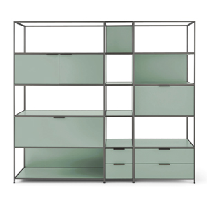 Dita (Ligne Roset), design Pagnon & Pelhaître, modulární knihovna s konstrukcí z hliníkových profilů v povrchové úpravě kartáčovaný bronz a s barevně lakovanými pohledovými panely, cena 213 900 Kč → www.ligne-roset.com