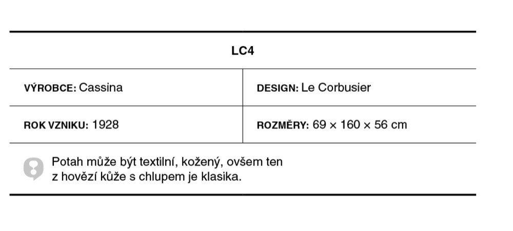 Le Corbusier zastával názor, že nábytek by měl být prodloužením našich končetin. LC4 je navržená tak, aby odrážela přirozené křivky lidského těla v klidu, pohyblivý rám se přizpůsobuje při každém pohybu. Charlotte Perriand zapózovala na lenošce pro reklamní účely v sukni v na tu dobu odvážné poloze. Fotka okamžitě přitáhla k LC4 Chaise Lounge pozornost a drží si ji dosud. Lenoška je vystavena v Muzeu moderního umění v New Yorku, vystupuje ve filmu 9 a ½ týdne a prý se také pravidelně objevuje ve filmech pro dospělé.