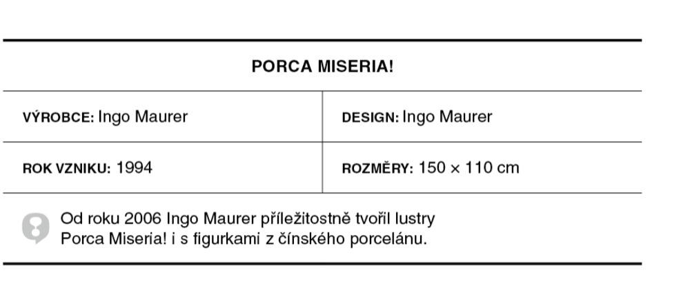 Inspiroval se fascinující scénou z filmu Michelangela Antonioniho, v níž je zachycen zpomalený výbuch vily. Každá Porca Miseria! vznikla výhradně na objednávku, ruční prací čtyř lidí, kteří rozbíjeli porcelán kladivem nebo o podlahu a designér poté hledal ty správné střepy pro unikátní kompozici. Ingo Maurer sice v roce 2019 zemřel, ovšem jeho dílo si můžete prohlédnout ve sbírce designu Muzea moderního umění v New Yorku.