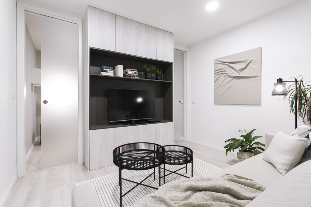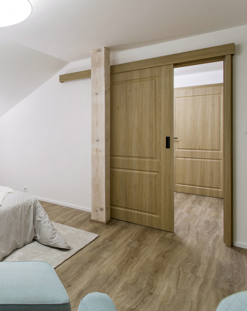 Víte, že posuvné dveře existují i ve variantě, která nevyžaduje stavební úpravy? Jedná se o posuvný systém na zeď. Tento systém vyniká svojí univerzálností a úsporou místa. Posuvné dveře na zeď sice vyžadují volný prostor na stěně vedle dveří, ale místnosti snadno propojíte, aniž by dveřní křídlo jakkoli překáželo. Dveře totiž v otevřeném stavu nezasahují do prostoru místnosti.