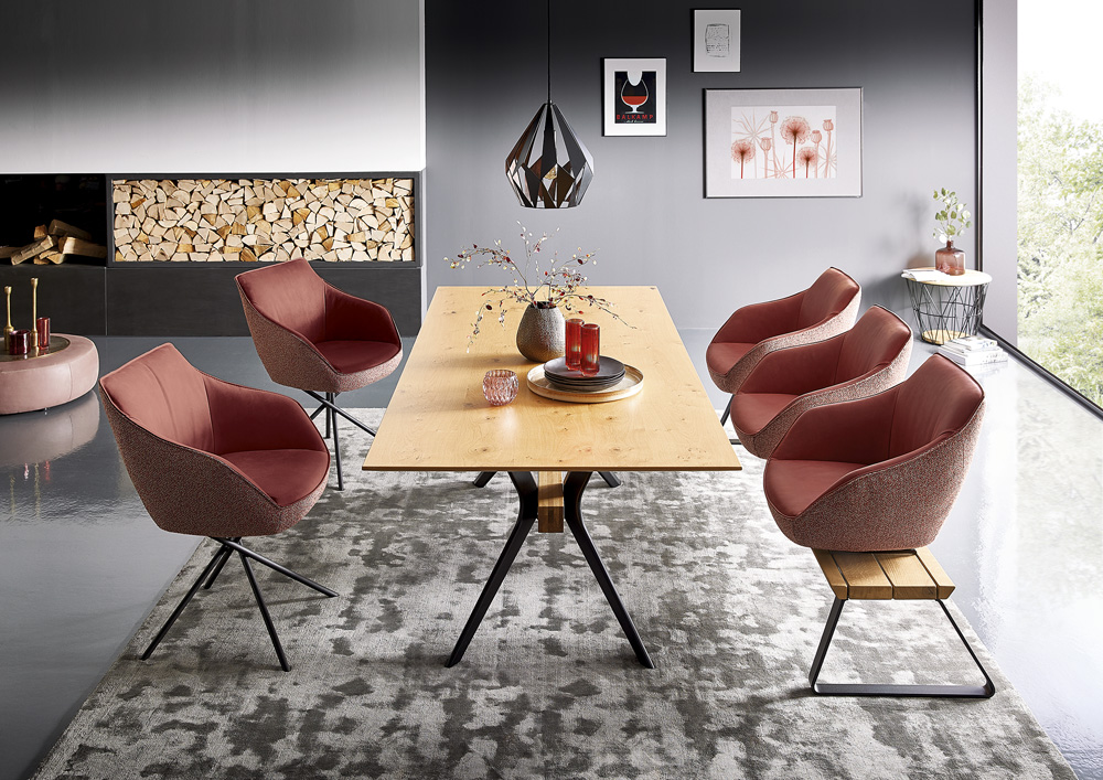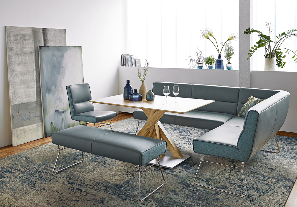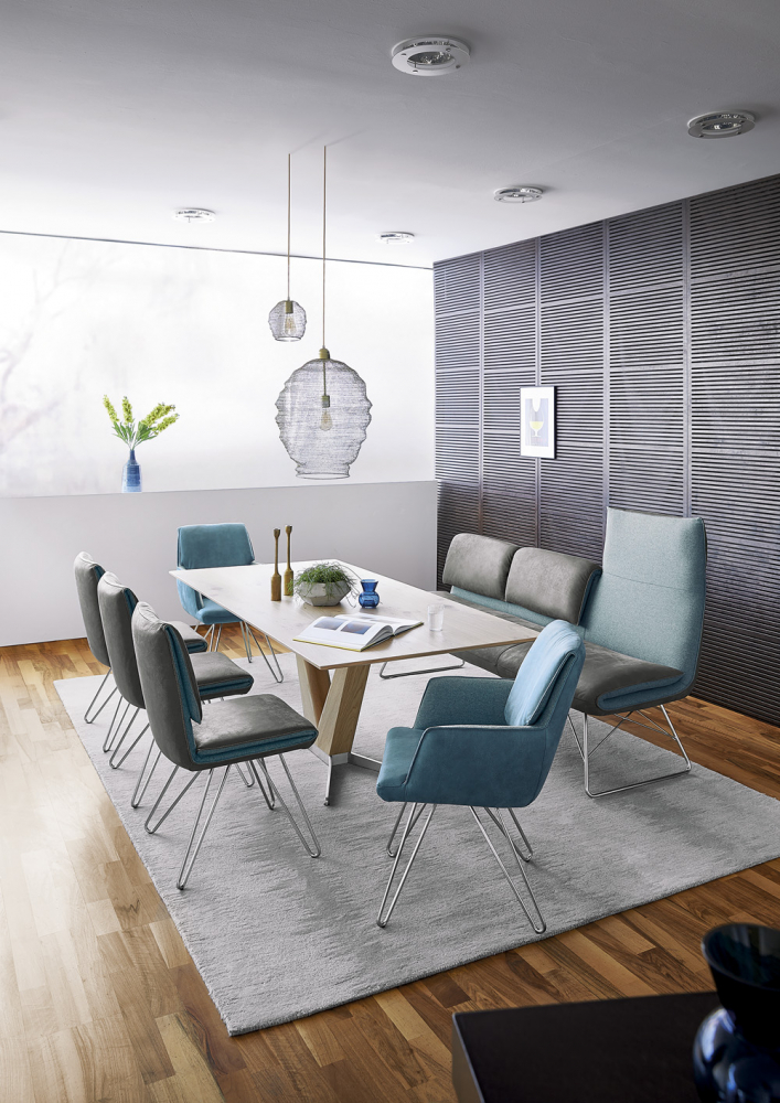 V nabídce je látkové i kožené čalounění a pozornosti by rozhodně neměla uniknout ani možnost kontrastního prošití. Možnosti výběru podléhá i podnoží. To může být pevné, otočné i takové, které se po vysednutí člověka z židle samo vrátí do původní polohy. Nebývalou renesanci pak zažívají také jídelní lavice. Do vínku však dostávají o poznání zajímavější tvary i materiály. KOINOR má v nabídce hned šestnáct typů, které svým designem navazují na jídelní židle i křesílka. Tím vzniká možnost všechny kousky jednoduše kombinovat do vkusného jídelního celku.