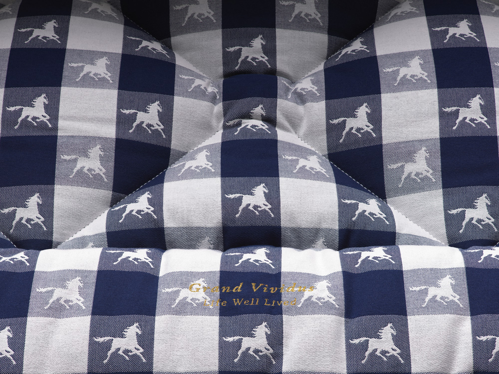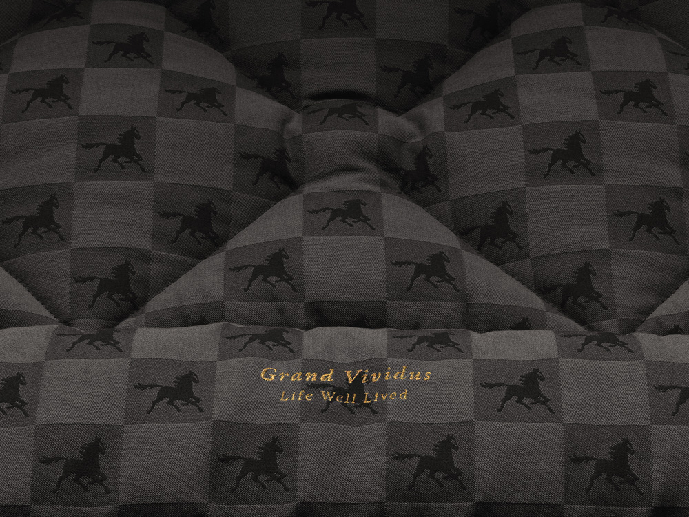 Grand Vividus je ručně čalouněna jedinečnou tkaninou ze 100% bavlny navrženou Ferrisem Rafaulim na základě ikonických odznaků Hästens vytvořených v roce 1917. Přirozeně vyčiněná kůže – vysoce kvalitní evropská kůže zpracovaná bez chemikálií a pečlivě barvená ve čtyřech jedinečných barvách, které vybral Ferris Rafauli, aby vyhovovaly většině barevných schémat interiéru.