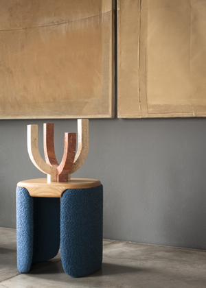 Práce s grafickým vzorem jako nositelem identity je patrná také v kolekci Velia, zahrnující křeslo, malou pohovku a taburet. Hluboké vertikální prošívání, viditelné z obou stran, přesně kopíruje záhyby skořápky a vytváří siluetu připomínající okvětní lístek, který se otevírá směrem dovnitř.