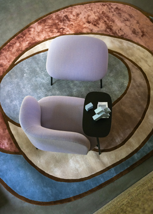 Motiv křesla à oreillettes se objevuje také v kolekci Peggy, která ikonickou typologii interpretuje odlehčeněji. Namísto uzavřené skořápky zde najdeme oválnou opěrku hlavy rozevírající se směrem ven, s jasnou inspirací designem 50. let.