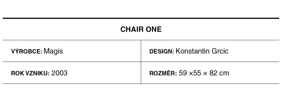„Bylo to možná poprvé, kdy byl tak velký odlitek použit na výrobu židle, obyčejně se tato technologie používala na menší komponenty. Jednalo se tedy o těžký úkol. Rozhodl jsem se rozdělit plochy do tenkých sekcí, podobných větvím stromů, a nechal tok materiálu formou vytvořit tvar, který vypadá jako mřížka, ale je trojrozměrný,“ popsal proces vzniku židle sám autor designu Konstantin Grcic. Chair One je dostupná ve stohovatelné verzi se čtyřmi nohami nebo s kancelářskou či betonovou podnoží a aktuálně zdobí nejen řadu soukromých i veřejných interiérů, ale je také součástí stálých sbírek mnoha prestižních muzeí včetně newyorské MoMA nebo pařížského Centre Pompidou.