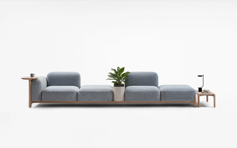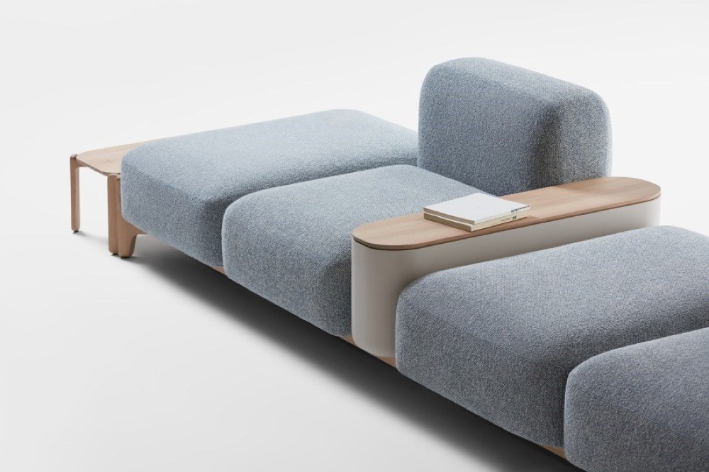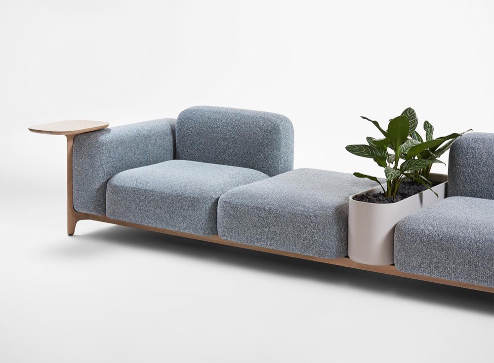Hravé aranžmá abstraktních objemů snadno vytvoříte prostřednictvím modulárního systému Sabot (Prostoria), který rámuje dřevěná konstrukce obohacená o odkládací stolky, integrované květináče i úložné prostory.