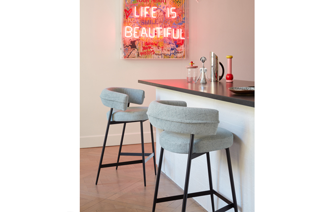 Barová židle s velkým vizuálním dopadem díky kontrastu mezi lehkým rámem a velkorysými obrysy čalouněných prvků.