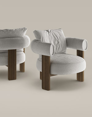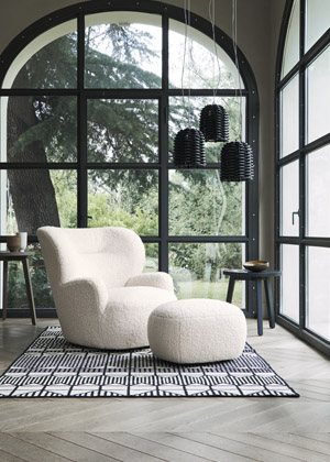 Foto: GervasoniKřeslo Loll 09 s pufem (Gervasoni), design Paola Navone, otočné s vratným mechanismem, dřevěný rám, polyuretan, odnímatelná textilie, 90 × 100 × 82 cm, orientační cena 80 000 Kč → shop.mohd.it