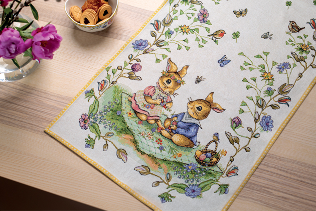 Sváteční ubrus má své místo při každé významné příležitosti. Oslava jara není výjimkou. Proto můžete váš jídelní stůl zkrášlit středovým ubrusem z gobelínu s motivy zajíčků na pikniku, jak jinak než z dílny světové porcelánky Villeroy & Boch. Velikonoční běhoun o rozměrech 49 x 143 cm pořídíte v prodejnách Potten & Pannen – Staněk nebo na www.pottenpannen.cz za 1 185 Kč, dostupné od 21. 2. 2022.