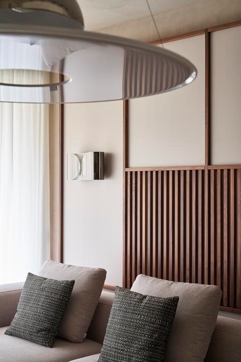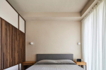 Ložnice pak představuje intimní útočiště. Jemné stěny z Argille obklopují čalouněné čelo postele a dřevěné lamely, které skrývají úložné prostory. Povrchy jsou měkké, tlumené a vizuálně uklidňující – prostor je navržen tak, aby podporoval odpočinek a soustředění.