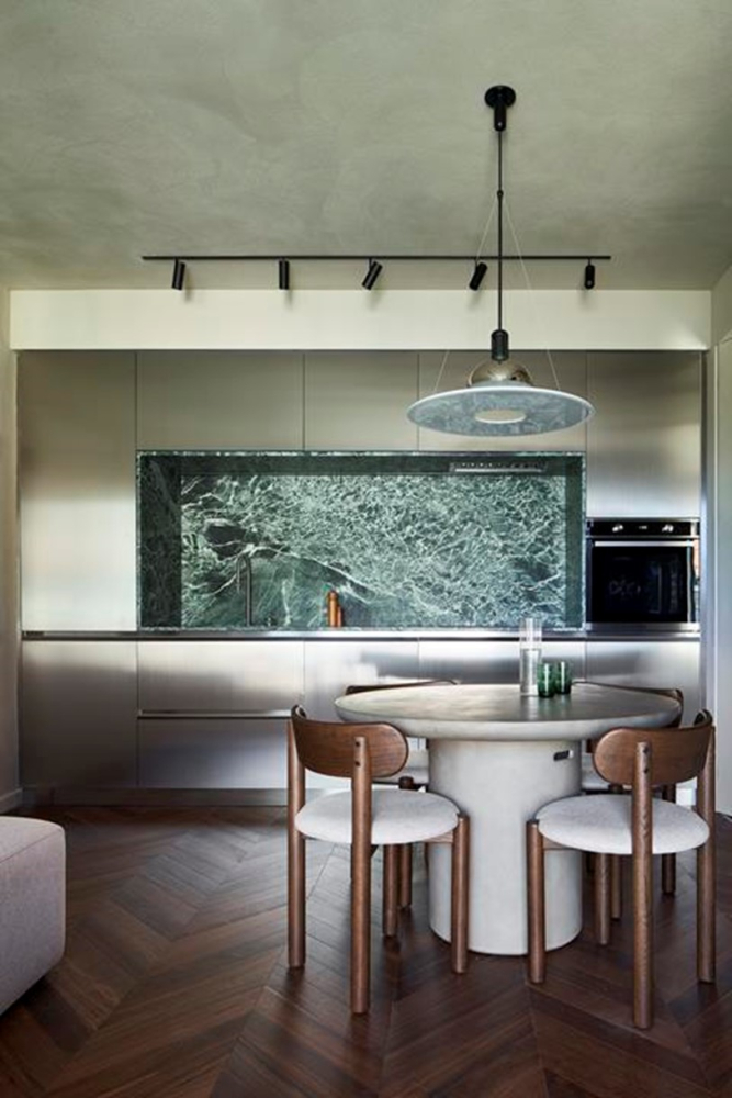 Foto: HD SurfaceKuchyňská část přináší kontrast – metalické prvky a mramorový backsplash vytvářejí dialog mezi technickou přesností a dekorativním gestem. Minimalistické uspořádání respektuje funkci, zatímco materiály dodávají prostoru charakter. Je to kuchyň, která není jen místem přípravy jídla, ale součástí celkové estetické zkušenosti.