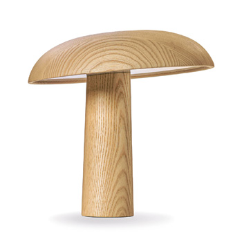 Forma (ClassiCon) je reinterpretací klasické stolní lampy z 50. let. Designér Christian Haas původní tvar zredukoval, a vytvořil tak nezaměnitelnou siluetu – asymetrie základny a klenutého stínidla propůjčuje lampě až organický vzhled. Namísto kovu použil masivní jasanové a ořechové dřevo. Rozměry 34 × 38 cm, cena od 49 990 Kč. → www.classicon.com