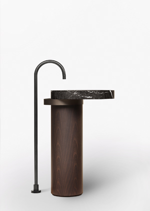 Eccentrico (Falper), umyvadlo z materiálu Cristalplant usazené na válcovitém dřevěném podstavci a doplněné držákem na ručník, 56 × 90 × 63 cm, cena na dotaz → www.koupelny-ptacek.cz