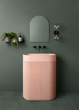 Foto: KastAura Pedestal (Kast), monolitické umyvadlo s jemně vroubkovaným povrchem, materiál beton, dostupnost v osmadvaceti barevných variantách, cena na dotaz → www.kastconcretebasins.com