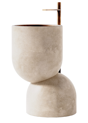 Architekti ze studia LATOxLATO představili kolekci Maat (Pimar) pojmenovanou po egyptské bohyni rovnováhy a harmonie, jejíž součástí je také volně stojící umyvadlo vytesané z kamene zamýšlené jako pocta barokní architektuře. Podstavec válcovitého tvaru ukrývá mísu z mědi. Cena na dotaz.