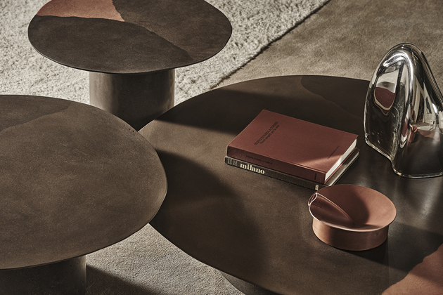 Na druhé straně je konferenční stolek Re-verre, inspirovaný opětovným použitím skla od Federicy Biasi. „Přivést sklo zpět k životu“: koncept malých stolků, které se zrodily z myšlenky recyklace.