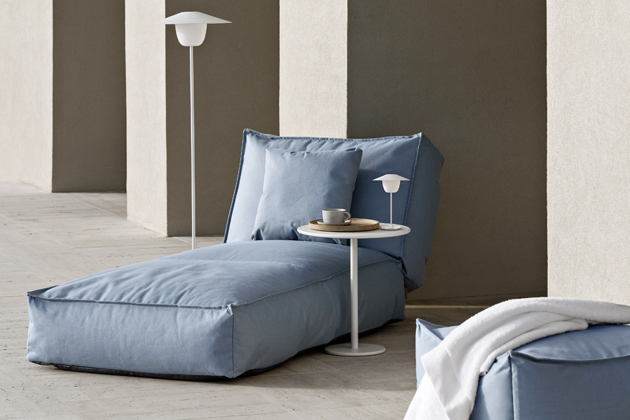 Lehátko a stolek Stay (Blomus), design studio Kaschkasch, odolná outdoorová textilie, odolná polystyrenová náplň EPS, více barev, stolek z lakovaného hliníku, cena lehátka 16 975 Kč, cena stolku 3 475 Kč → www.blomus.cz