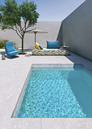 Kolekce Casilda (Talenti), design Ramón Esteve, lakovaný ocelový rám, extra měkká, různé materiály, novinkou deska stolu složená z lamel lávového kamene, cena na dotaz → en.talentispa.com