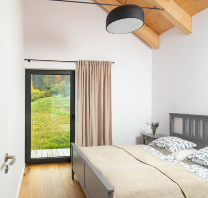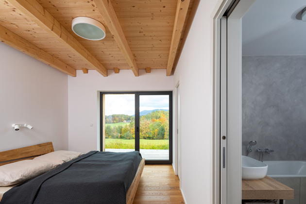 Vedle obývací části je vstup do hlavní ložnice majitelů. Jsou zde opět bílé stěny v kombinaci s rovným dřevěným stropem s přiznanými trámy, se kterými ladí i přírodní dřevěná podlaha. V centru ložnice stojí masivní dřevěná postel, nad kterou jsou na stěně dvě bílé lampičky. Stropní světlo s jeho černým obrysem a bílým krytem vytváří iluzi plného měsíce na noční obloze. Z ložnice navíc vede vlastní východ francouzskými dveřmi přímo na terasu, odkud se opět nabízí malebný výhled na údolí a vrcholky Moravskoslezských Beskyd.