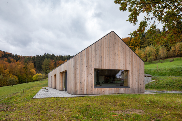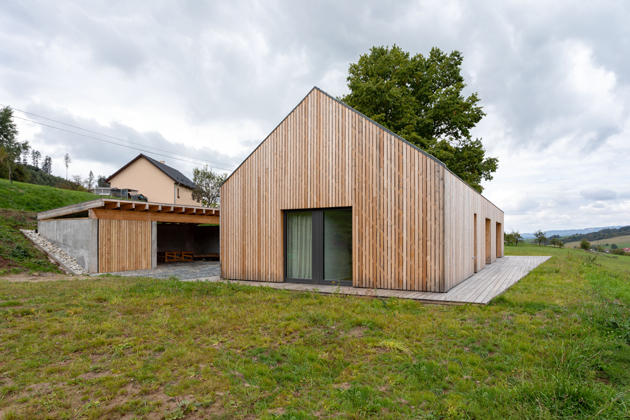 „Dřevostavba je už na pohled charakteristická svou fošínkovou konstrukcí s provětrávanou modřínovou fasádou,“ upřesňuje architekt Mrva. Přední část domu zdobí nejen dřevěné obložení ale i zajímavě řešené okno, které propouští světlo do interiéru, ale současně zajišťuje soukromí místnosti. Podél domu vede úzký chodník, který umožňuje obchůzku kolem celé stavby. Na opačné straně domu, kam lze také vyjít z obývacího pokoje i ložnice, se pochozí lem domu rozšiřuje do terasy.