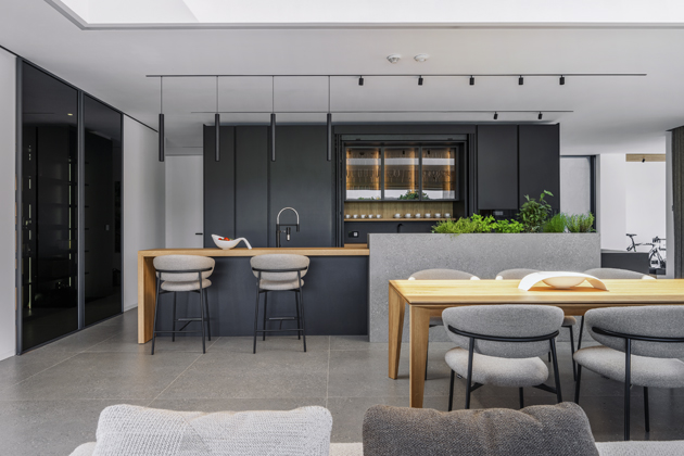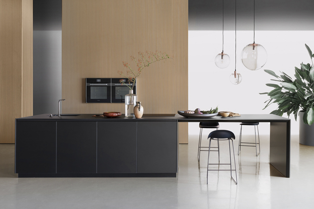 Kuchyň nabitá spotřebiči, disponující spíží i dalším úložným prostorem a zároveň působící harmonicky v kontextu obývacího prostoru není utopie. V případě této kuchyně (Sykora) kýžený výsledek zajišťují vysoké posuvné panely v lakovaném provedení Black Graphite Evermatt, kterými lze kuchyň podle potřeby uzavřít → www.sykora.eu