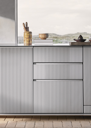 O tom, že kov má v kuchyni velký potenciál a jeho rezervy nejsou zdaleka vyčerpány, svědčí nová sestava V3 (Vipp) z eloxovaného hliníku s vroubkovaným povrchem. Umnost zpracování tohoto materiálu zdůrazňují oblé rohy ostrůvku a čtyři milimetry silná deska z nerezavějící oceli → www.stockist.cz
