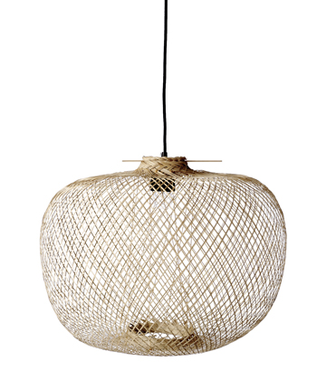 Závěsný lustr Rodi (Bloomingville) z proplétaných bambusových vláken rozehraje v pokoji úžasnou stínohru, rozměr 42 × 30 cm, cena 4 839 Kč