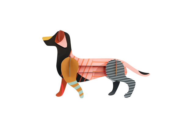 Papírová 3D dekorace jezevčík Maggie (Studio Roof), vyrobená z recyklovaného papíru a tištěná přírodními barvami, cena na dotaz