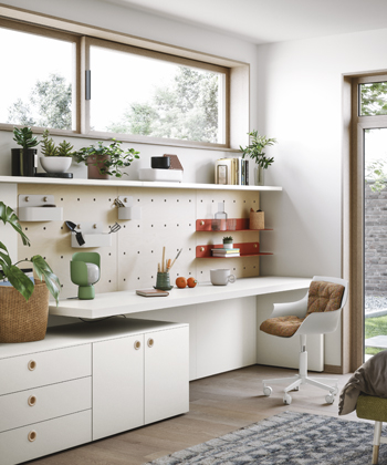 Zařízení pokoje Next 11 (Nidi) se vyrábí zakázkově. Součástí vzorové sestavy je čalouněná postel, pracovní kout, policový systém Loop a šatna, cena 275 880 Kč