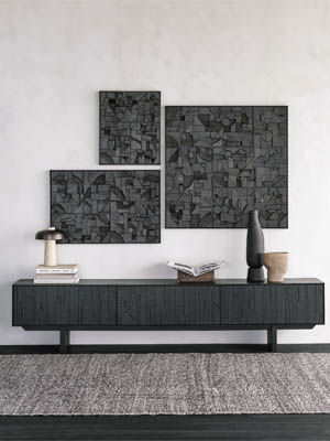 Mosaic (Ethnicraft), design Alain van Havre, teaková komoda s reliéfními dvířky vrstvenými z kousků mahagonového dřeva, rozměry 227 × 45 × 82 cm, cena 74 074 Kč → www.stockist.cz