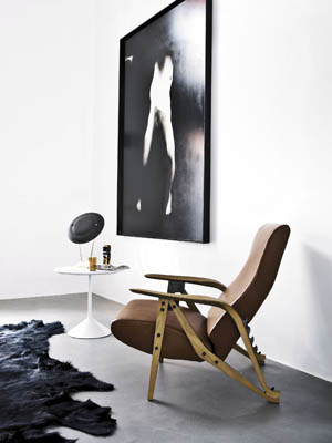 Gilda 888 (Zanotta), design Carlo Mollino, křesílko podle návrhu z roku 1954, konstrukce z dubového dřeva, polyuretanová výplň potažená kůží, cena 107 604 Kč → www.puntodesign.cz