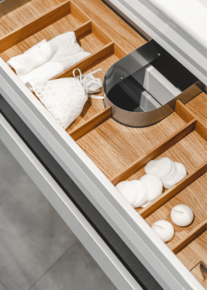 Dokonalost se skrývá v detailu. Proto si udělejte systém a řád i uvnitř zásuvek a skříněk. Dobrými pomocníky mohou být různé organizéry a pořadače. „Vytvořit systém uvnitř koupelnového nábytku je třeba zejména v případě velkých kontejnerových zásuvek. Vhodně zvolené pořadače a organizéry rozšíří množství úložného prostoru a jsou velmi praktické,“ říká Ing. Petr Blažek z Dřevojasu. Nejrůznější kosmetické pomůcky, dekorativní kosmetika, ozdoby do vlasů a další drobnosti tak pomocí různých pořadačů ve formě větších či menších krabiček budou mít přesně dané místo.
