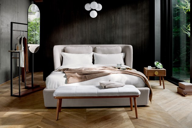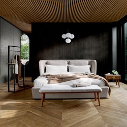 Nazelenalá barva ranní mlhy společně s kovovými akcenty jemně vynikne na pozadí granitově šedé i odstínů pouštního písku. Paletu dobře doplní teplé tóny dubového dřeva a dokonale orámuje černě lakovaný kov.