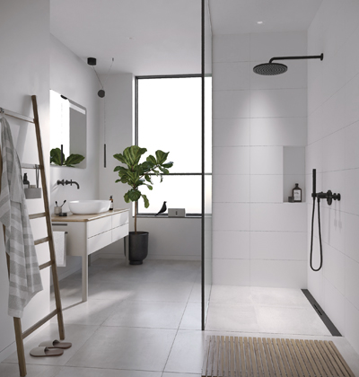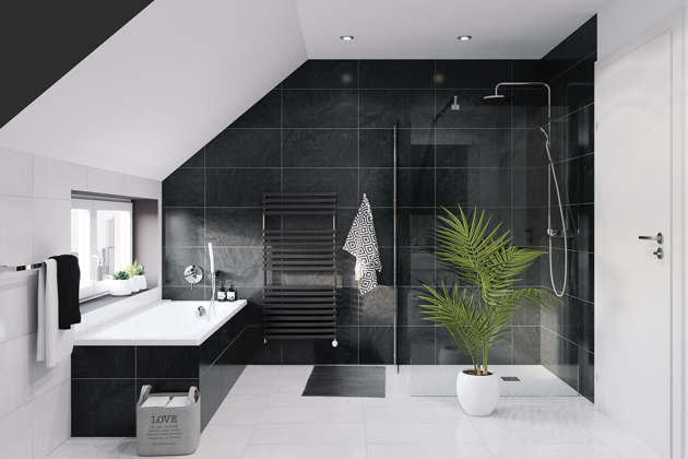 Chicago (Hornbach), koupelna vybavená vanou D-Code (Duravit), sprchovým koutem s bezrámovou skleněnou příčkou a dešťovou sprchou a designovým topným tělesem Genf (Schulte), cena na dotaz → www.hornbach.cz