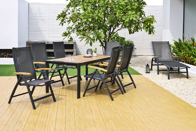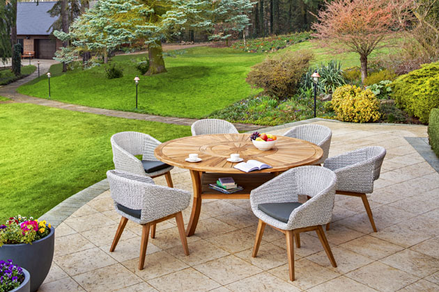 Stůl Colosseum a křesla Devi (Mountfield), stůl – teakové masivní dřevo, otočný střed stolu, 155 × 76 cm, více rozměrů, cena 17 990 Kč, křeslo – teakové masivní dřevo, kroucené syntetické vlákno Viro Polyfiber, odnímatelný podsedák, cena 6 890 Kč, www.mountfield.cz