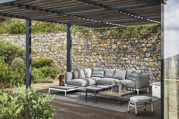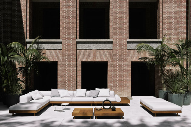 Sedací souprava Kasbah (Living Divani), design David Lopez Quincoces, teakový masiv a rychleschnoucí textilie, cena od 240 209 Kč, www.stockist.cz