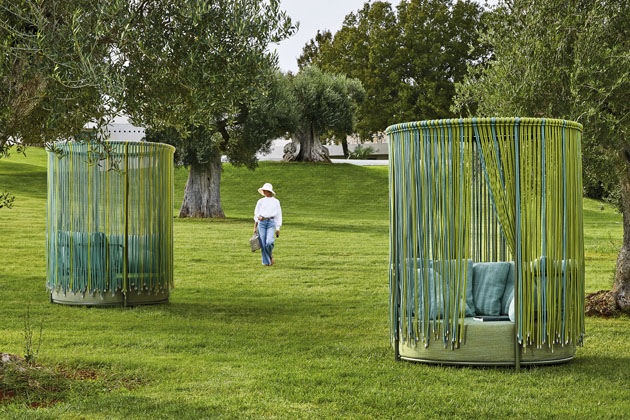 Kulaté lehátko s baldachýnem Oasi (Roberti Rattan), design Technical Emotions, lakovaná nerez ocel, odstín Forest, horní stínicí plachta z Batyline, ozdobná kruhová lana v relaxačních barvách lesa, outdoorové textilie, cena od 306 704 Kč, www.puntodesign.cz